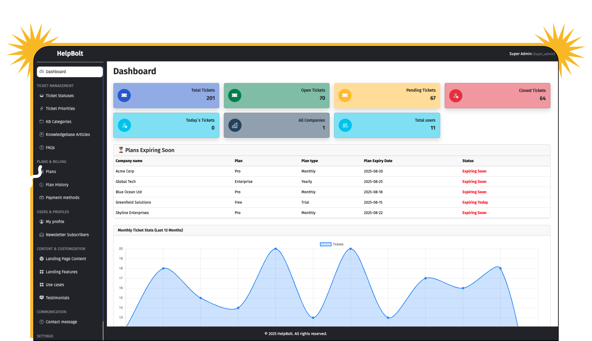 - Up to 10 Agents, Ticket Assignment Rules, Custom Branding, Knowledgebase & FAQ Module, 10 Articles, Multiple Ticket Categories, Advanced Reports, Working Hours Configuration